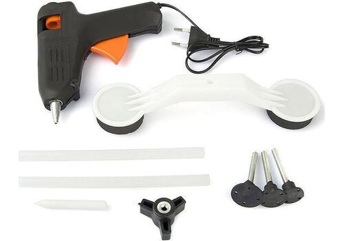 - Τοποθετήστε τη ράβδο σιλικόνης στο πιστόλι και αφήστε τη να ζεσταθεί. Καθαρίστε την επιφάνεια του βαθουλώματος. Στη συνέχεια βάλτε στη μαύρη επιφάνεια της "βίδας-βεντούζας" αρκετή ποσότητα σιλικόνης. Εφαρμόστε άμεσα τη "βίδα-βεντούζα" ακριβώς πάνω στο βαθούλωμα και αφήστε να κρυώσει για λίγα λεπτά. Τοποθετήστε τη "γέφυρα" από πάνω και βιδώστε το ειδικό καπάκι αργά και σταθερά μέχρι να ακούσετε τον ήχο της λαμαρίνας που έχει επανέλθει στην αρχική της θέση. Επαναλάβετε αν χρειαστεί και άλλες φορές.