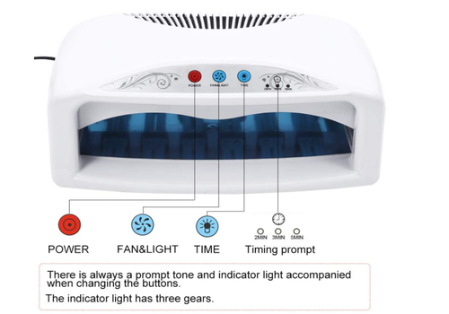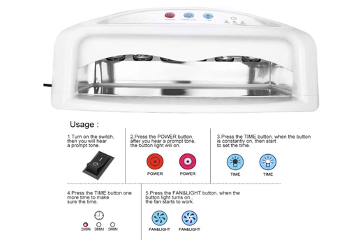 Διαθέτει 3 αυτόματους χρονοδιακόπτες με ρύθμιση 2 λεπτών, 3 λεπτών και 5 λεπτών, ανάλογα με τις ανάγκες και τις απαιτήσεις σας. Διαθέτει προηγμένο επαγγελματικό σχεδιασμό 36τμχ από πηγές διπλού φωτός UV και LED. Πιο κοντά στο λευκό φως που δεν βλάπτει τα μάτια σας.